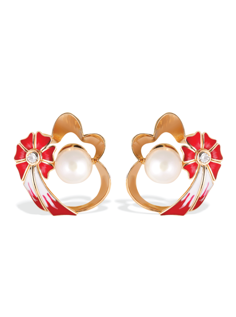 Crafted in warm, glowing gold, it features delicate shooting stars surrounded by soft swirls like clouds in a twilight sky. The diamond within the star sparkles with quiet intensity, while the star's tail streaks in bold red enamel, cutting through hand-painted white clouds that show the artist's deliberate brushstrokes. The pearl at the center rests like a wish yet to be spoken - patient, but persistent.